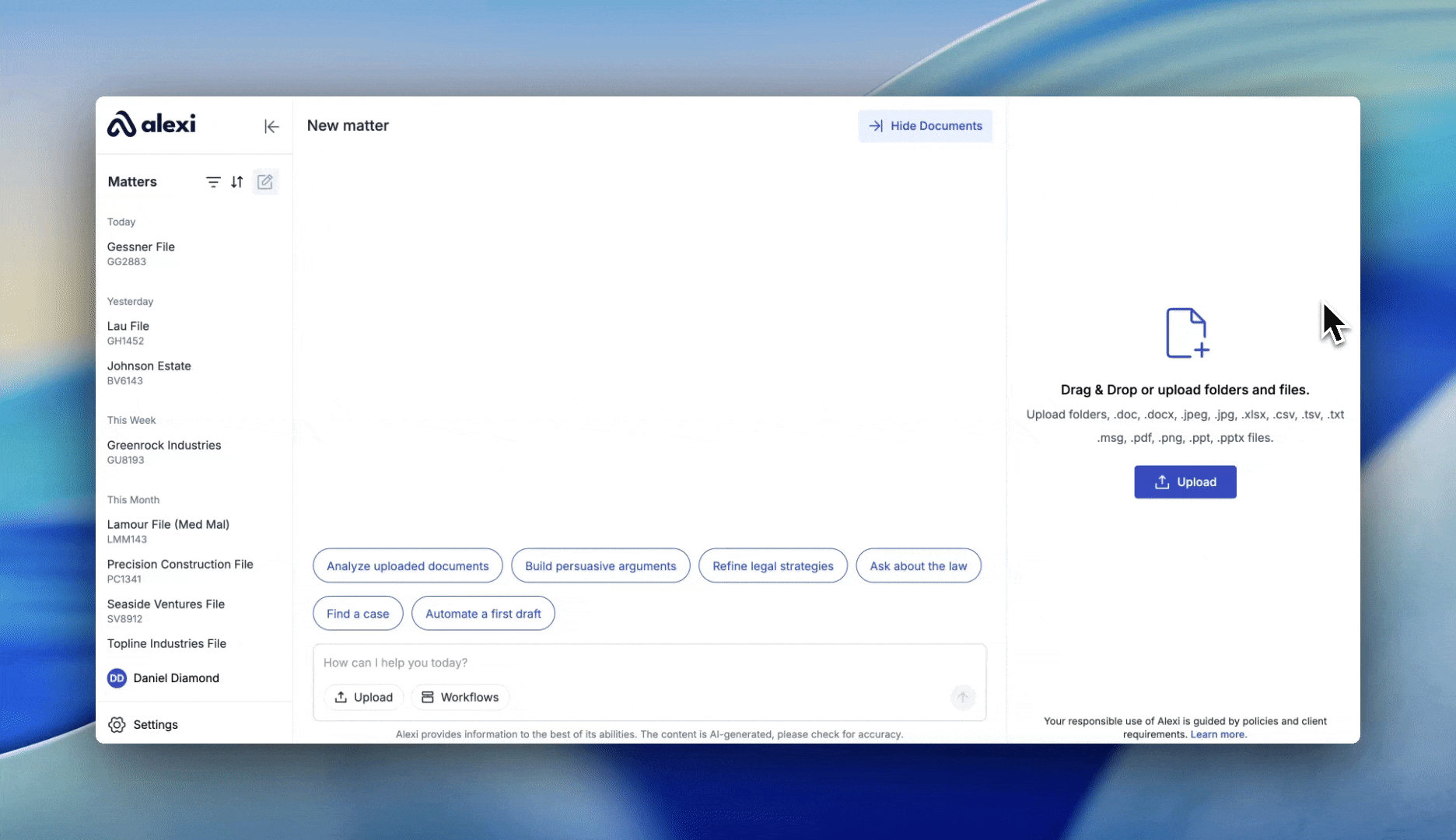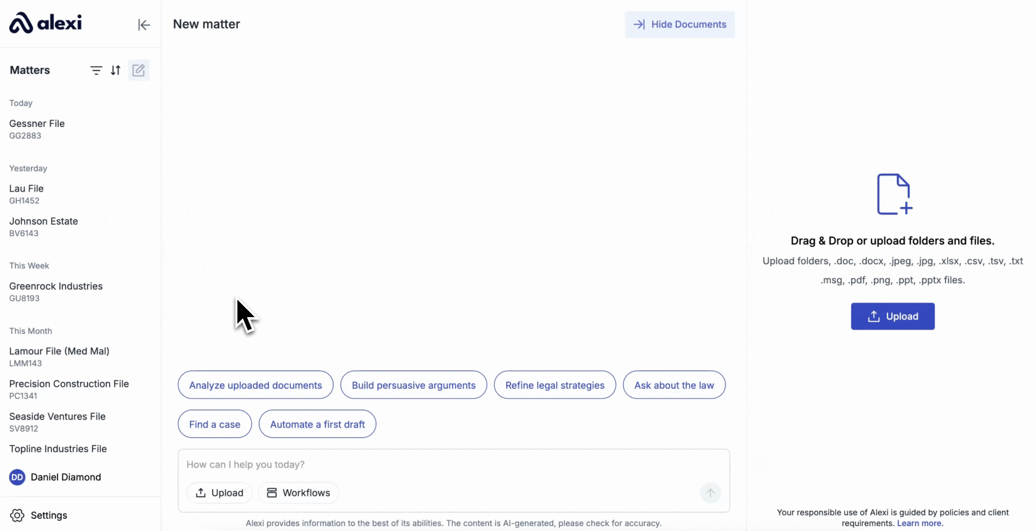 • Documents Panel: This panel stores all folders and files associated with a matter. You can upload your documents and save content generated by Alexi here.